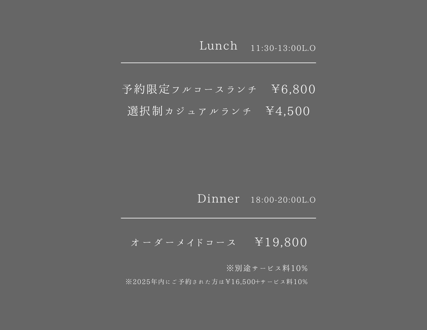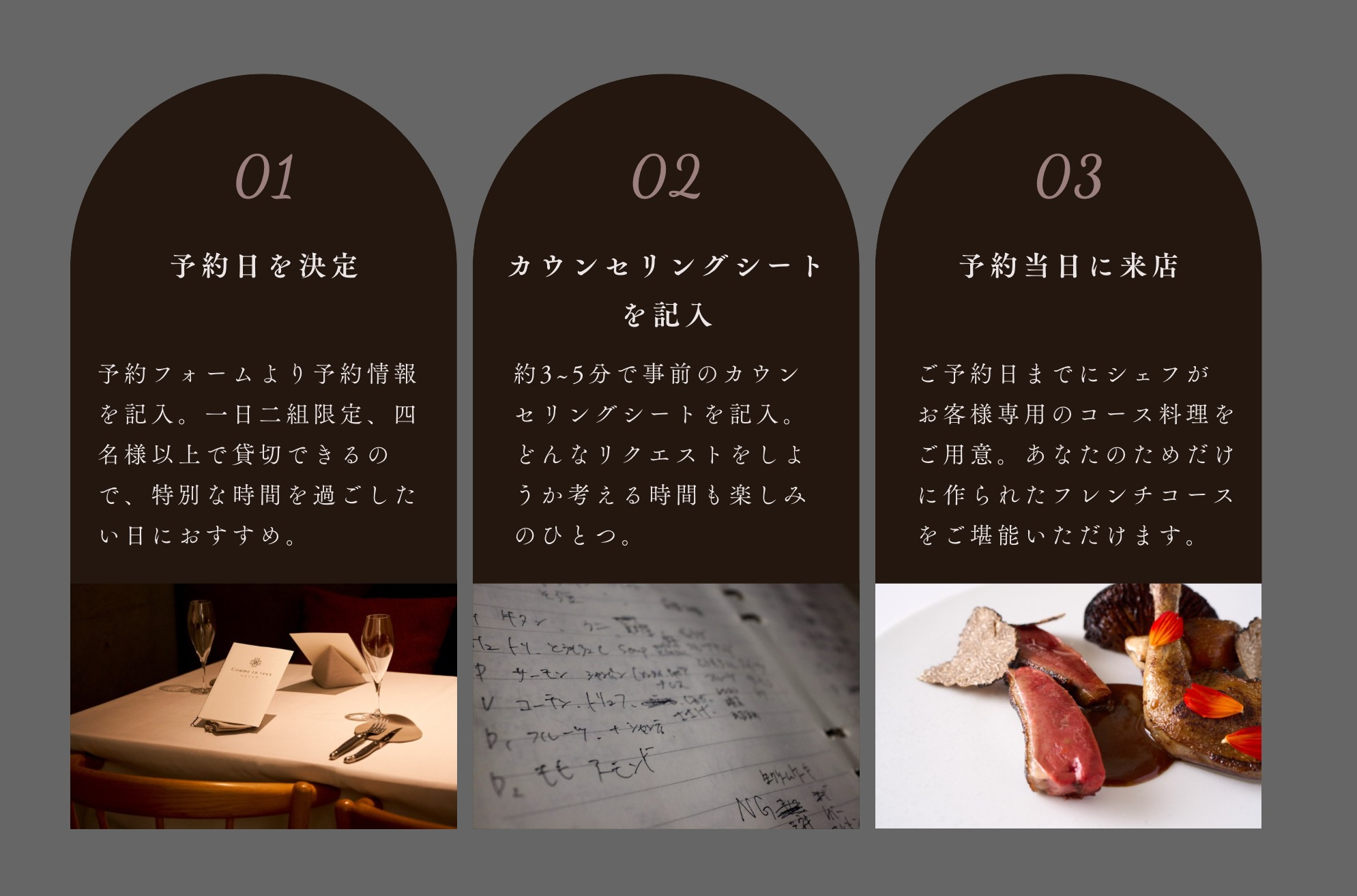 ディナーは完全予約制です。当レストランの予約フォーム、またはお電話でご予約ください。